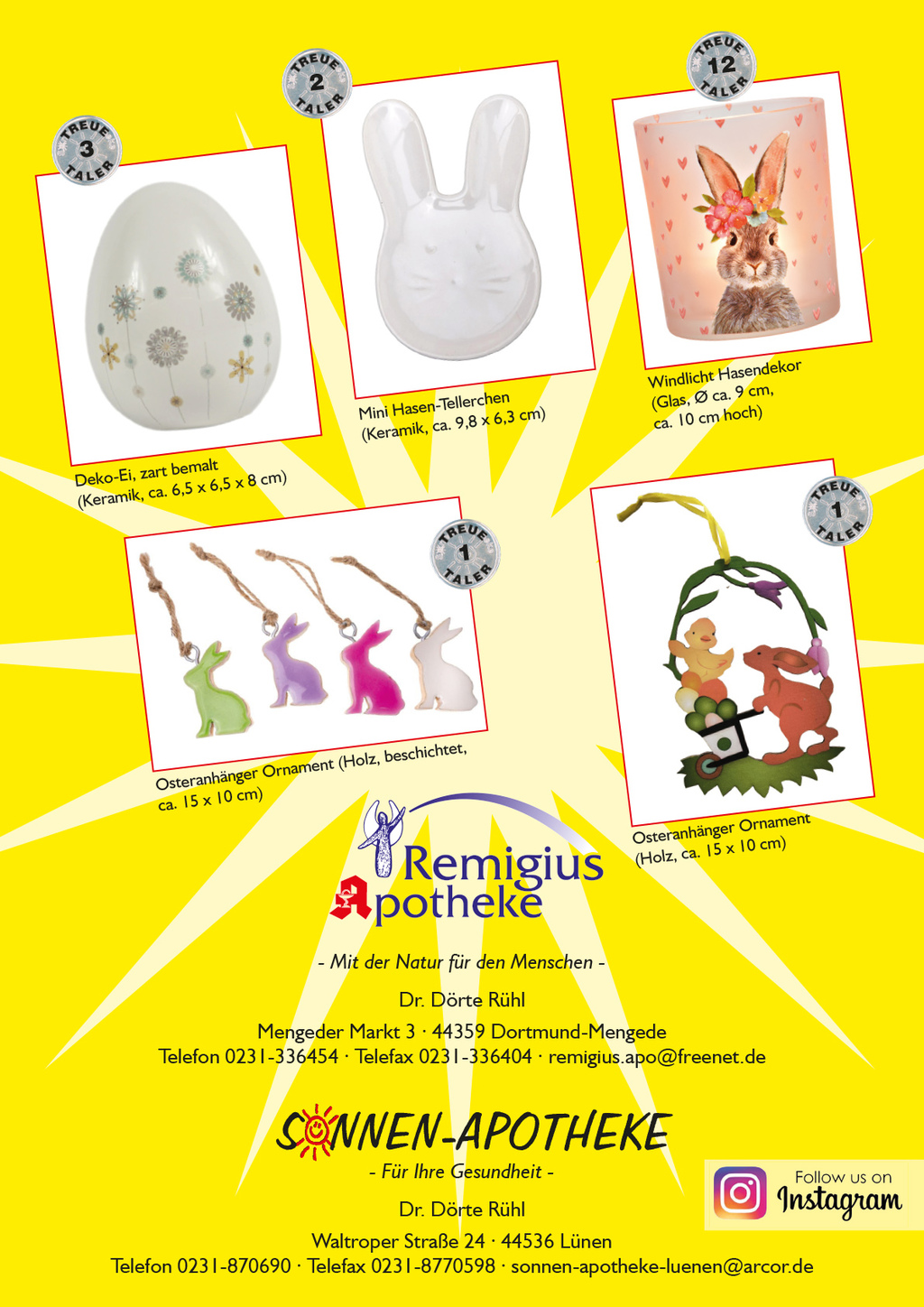 Unsere motivierten und freundlichen Mitarbeiter der Remigius Apotheke in Dortmund-Mengede und der Sonnen Apotheken in Lünen-Brambauer sind gerne für Sie da und freuen sich, Ihnen in Gesundheitsfragen weiterhelfen zu können.